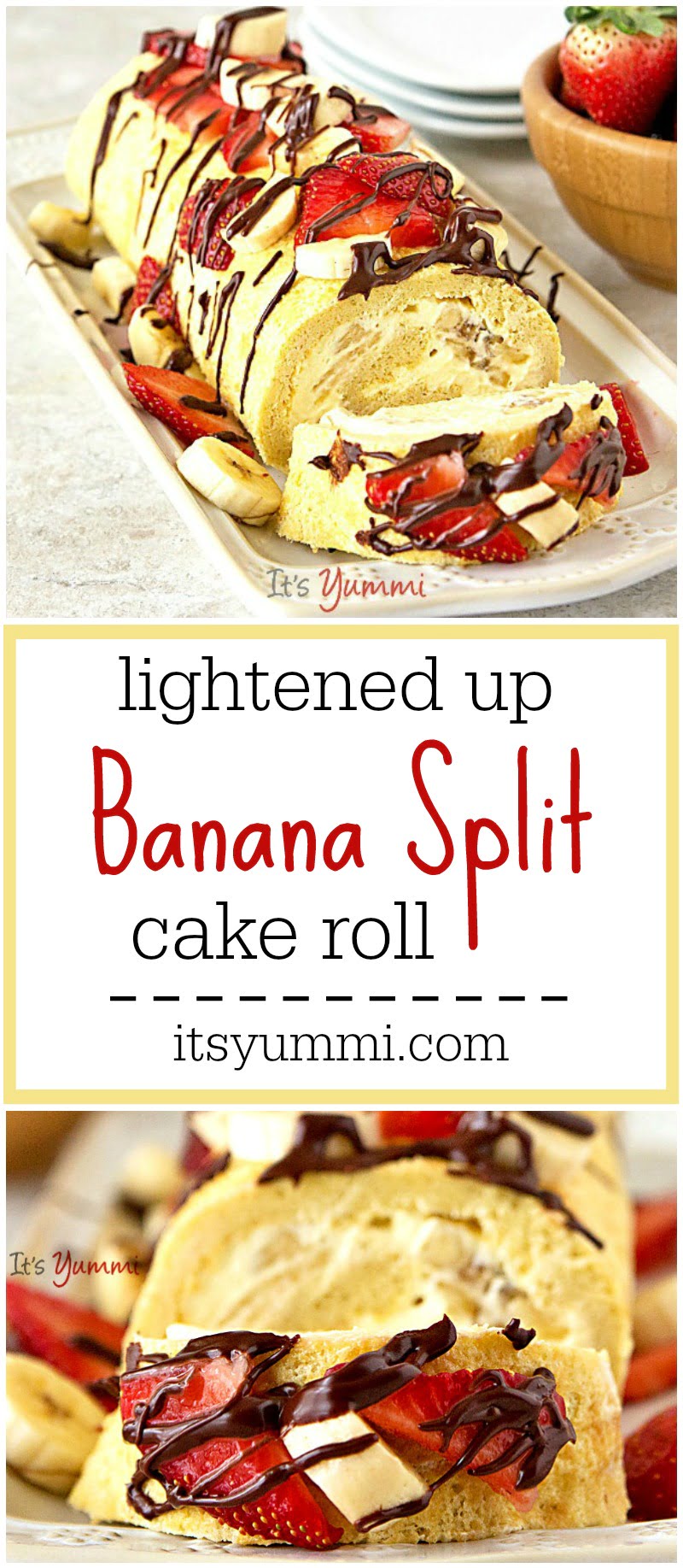 Cake rolls are just the best thing ever.. I love all the sweet cream and fruit in them. This banana split roll looks and sounds delicious – and I just LOVE how you have made it up a lightened up version!