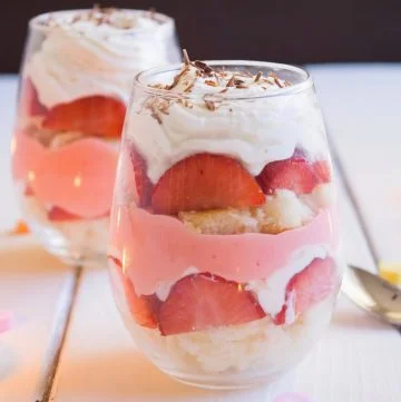 Trifle for two is the perfect Valentine’s Day dessert! Layers of orange flavored sponge cake, strawberries, traditional English custard, and orange infused whipped cream give this trifle for two it’s delicious flavor!